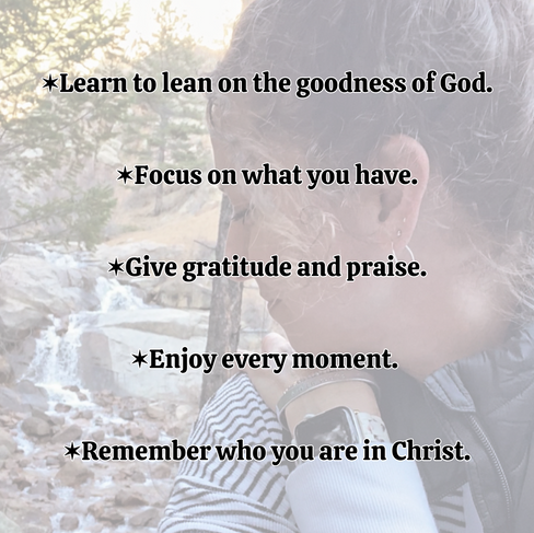 ✶ Give gratitude and praise. Looking at all we do have, leads us to a life of gratitude and praise. Thankfulness is a by-product of contentment. "In every situation [no matter what the circumstances] be thankful and continually give thanks to God; for this is the will of God for you in Christ Jesus." (1 Thessalonians 5:18 AMP) Give Him thanks for every circumstance because even when they seem bad, He is still good and He is still God. The attitude of gratitude is truly a catalyst of living a life of contentment. It's also God's will for us.